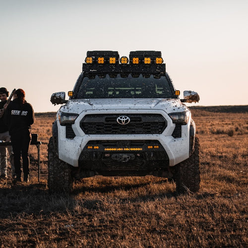 During the build we installed some Nitto Recon Grapplers E load 35/12.50R17 paired with the Relations Race Wheels RS7-H 17x8 +12 offset. Then we moved on to installing all the armor, the CBI offroad covert front bumper with a Warn winch and a Baja Designs 20” S8 light bar, CBI skids, rock sliders, a Prinsu Pro roof rack with two 83L Roam cases and 7 Baja Designs LP4s. After all that, we installed the CBI offroad bed rack to house the iKamper Skycamp 3.0 Mini with the rocky black shell.
