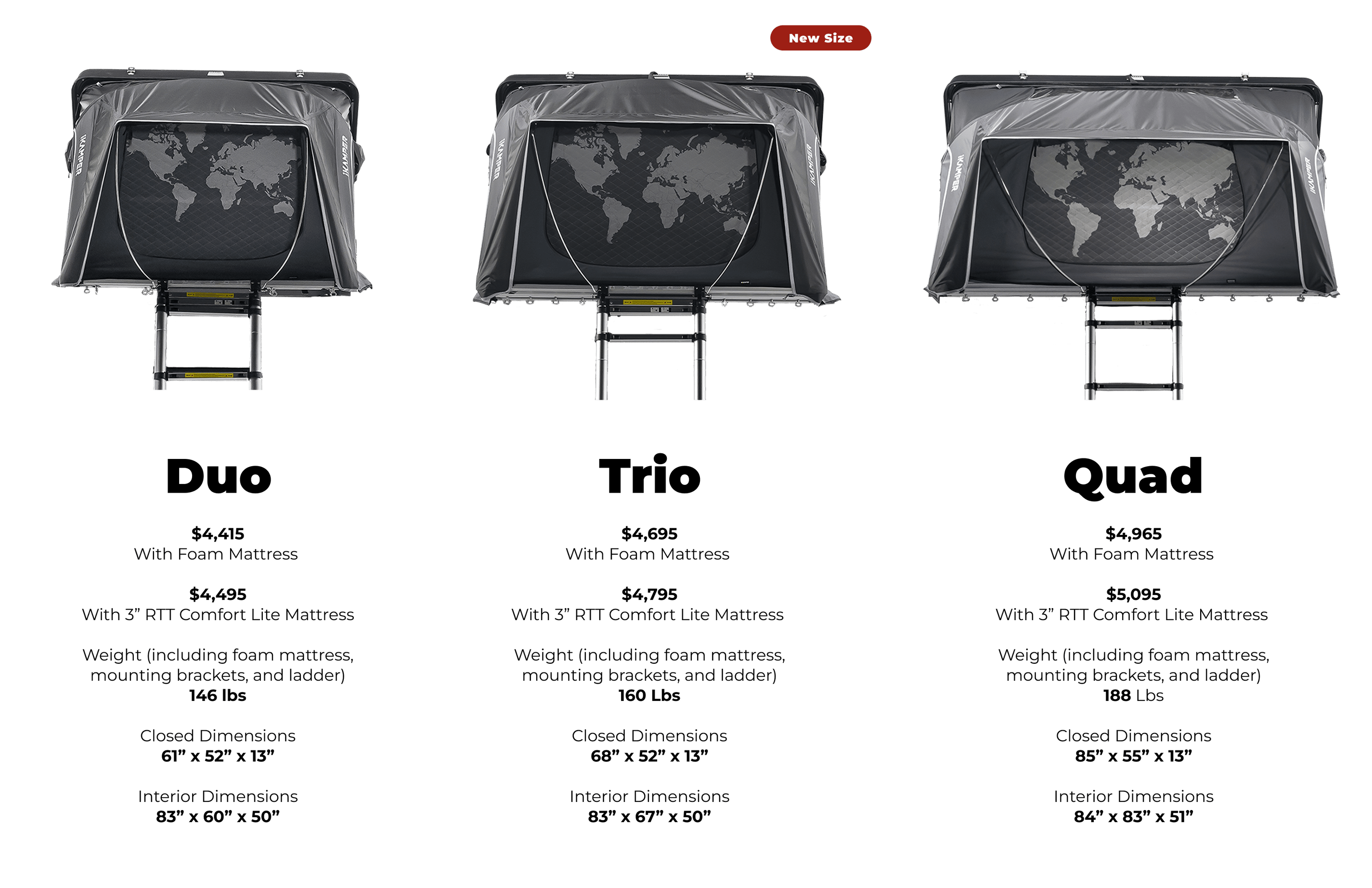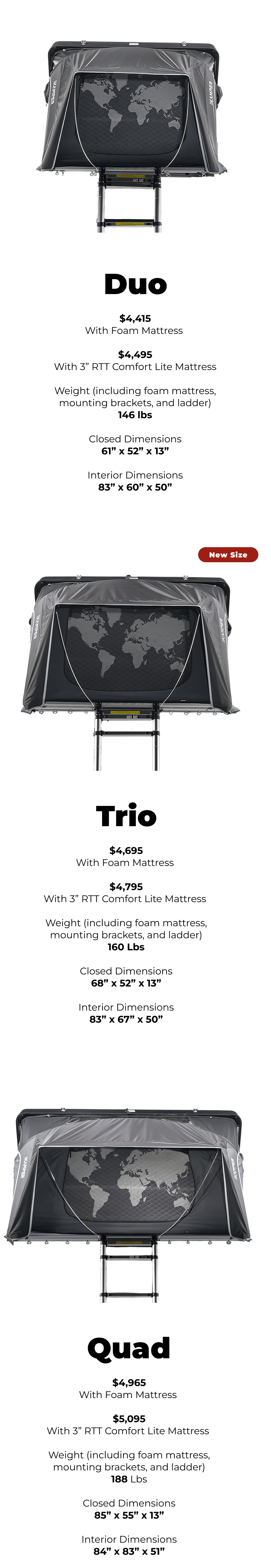 With three sizes and a narrower footprint for the Duo and new Trio, it’s easier than ever to find a Skycamp that fits your vehicle.